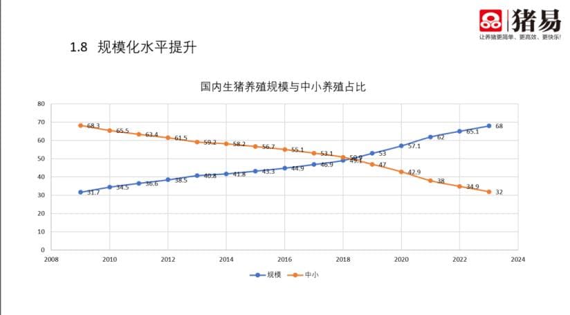 但是,自从2014年生猪养殖行业开始步入环保严管期后至今,规模化养殖成为大趋势。据统计,我国散养户的比例早就从2009年的70%下降到2023年的32%,与集团化养殖的比例发生了根本性的逆转。