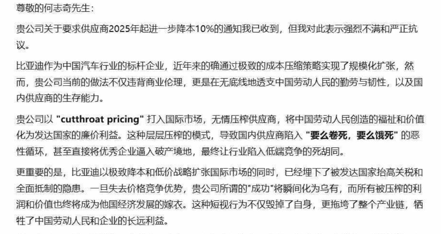 日前,一封比亚迪要求供应商降价的邮件在网络上流传。当中提到,“为增强比亚迪乘用车竞争力,我们需要整个供应链共同努力、持续降本,因此对供应商所供货产品提出要求:从2025年1月1日起降价10%”,落款是比亚迪集团执行副总裁、乘用车首席运营官何志奇。
