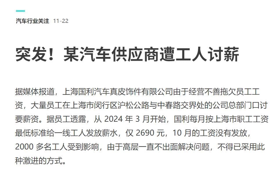 电车通留意到,今年供应商叫苦的新闻确实逐渐增多。据“汽车行业关注”报道,曾是主流的座椅生产厂商上海国利汽车真皮饰件有限公司由于拖欠员工工资,大量员工在公司总部门口讨要薪资。