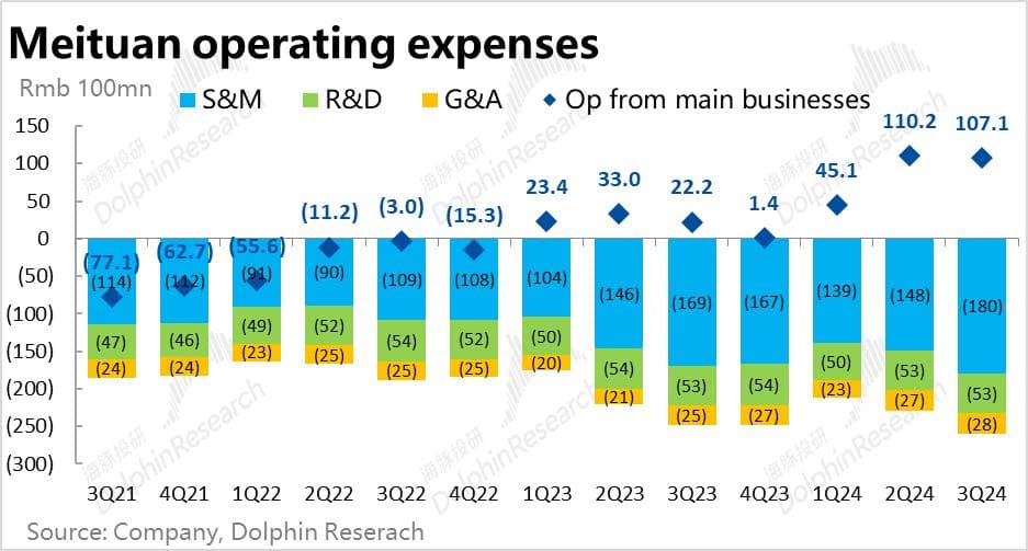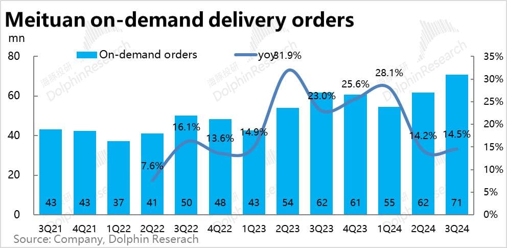 但广告性收入增速则环比下降了约1.6pct,佣金和广告业务增速的差距又拉大到了6pct,不禁让人联想起22年~23年初抖音和美团激烈竞争时的情形。但仅凭单季的表现还不足以表明美团和抖音对商家广告投流的竞争又再度明显抬头,仍需观察。也不排除是宏观因素下,商家对不能直接带来转化的广告预算整体下降导致的收入放缓。
