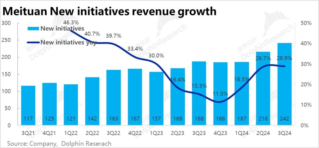 3、创新业务本季营收242亿,同比增长28.9%,较上季小幅提速,也比市场预期多出约8亿。据公司自己的解释,主要是小象和优选等零售型业务的增长较强,海外市场可能也有一些贡献。