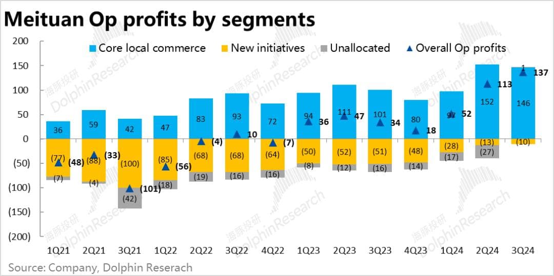 除此之外,集团层面未分配本季扭亏为盈,取得了1.3亿的正经营利润,相比彭博预期拉开了约20亿的超预期利润,可谓最大的单项贡献。但这主要因为本季美团确认了15.5亿的汇兑收益和5.7亿的投资性收益。对这些一次性利好带来的预期外利润,应当忽视。