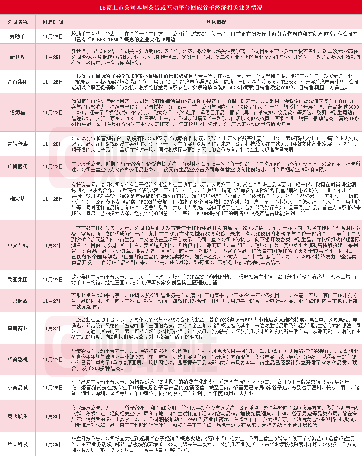 据财联社不完全统计,截至发稿,包括蜂助手、新世界、合百集团、汤姆猫、吉视传媒、广博股份、潮宏基、中文在线、欧亚集团、芒果超媒、森鹰窗业、华策影视、小商品城、奥飞娱乐和华立科技在内的15家上市公司本周公告或互动平台回应“谷子经济”相关业务情况,具体详见下图: