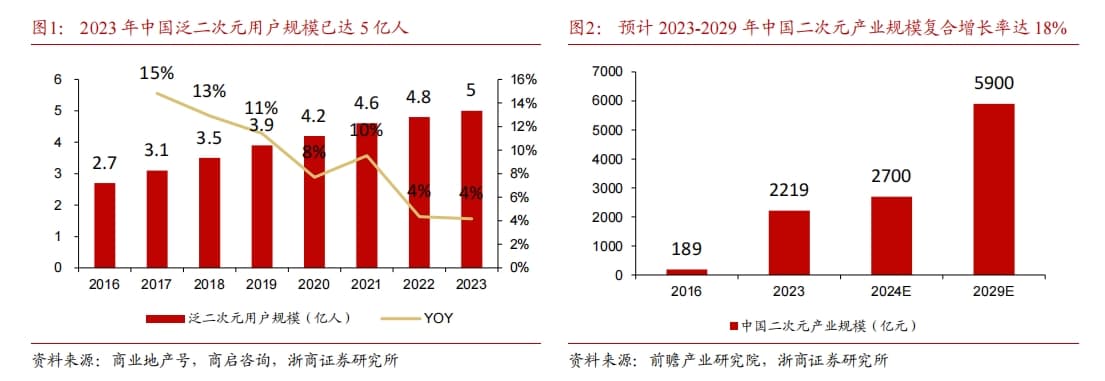 根据前瞻产业研究院数据,2016年-2023年,中国二次元产业规模从189亿元增长至2219亿元,复合增速42%。展望未来,预计2023年-2029年,二次元产业规模将从2219亿元增长至5900亿元,复合增速18%。截至2023年,中国泛二次元用户规模已突破5亿人,其中Z世代为主力群体。