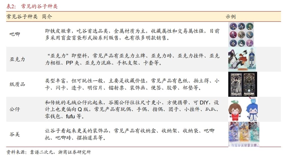 据介绍,谷子经济是近年来兴起的一种新型消费现象,主要指围绕二次元IP周边商品的消费文化和经济形态,简单来理解,可以是游戏、动漫、小说、电视剧的周边。根据IP来源,常见的可分为国谷、日谷;根据价格,通常分为普谷、湖景谷和海景谷(价格依次递增);根据品类和材质,可分为“吧唧”、公仔、亚克力、纸制品、谷美等。
