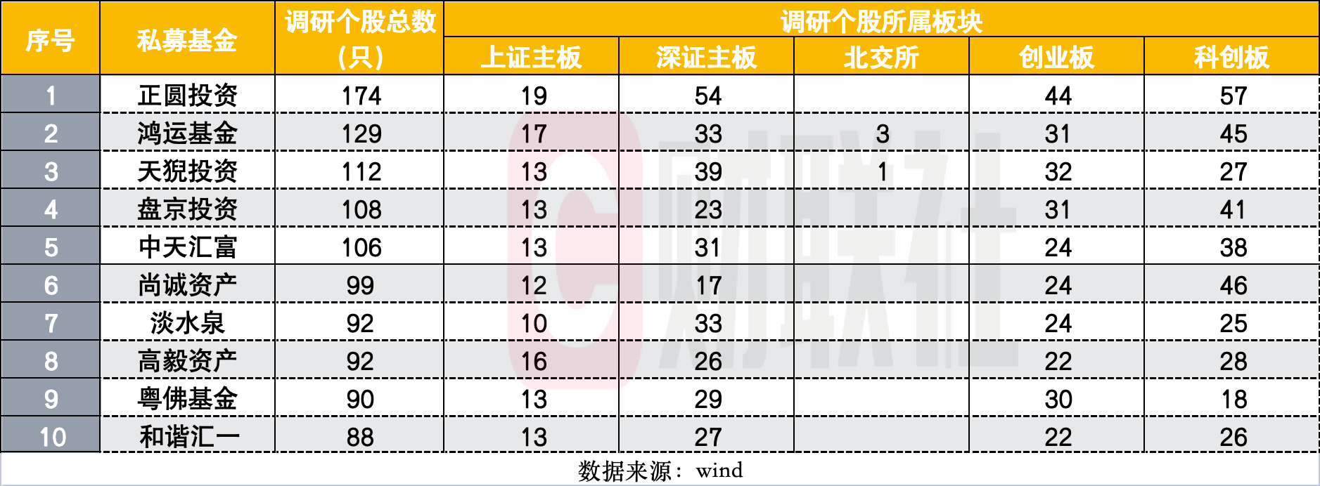 这期间,调研总次数超百次的私募共6家,调研个股超百只的私募有5家。