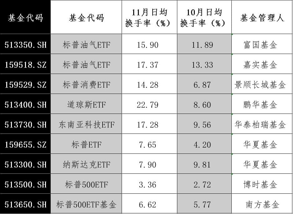 例如,近期市场关注热度较多的标普消费ETF,11月日均换手率为14.28%,较10月份(6.87)提升超7个百分点,标普油气ETF、道琼斯ETF、纳斯达克ETF、标普500ETF等基金11月份的换手活跃度较上月也有明显提升。