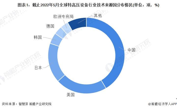 从2022年全球特高压技术专利分布来看,中国以41%的专利量稳居第一位,排在第二位的是美国(21.84%),第三位的是日本(16.99%),紧随其后的还有韩国、德国和欧洲等。