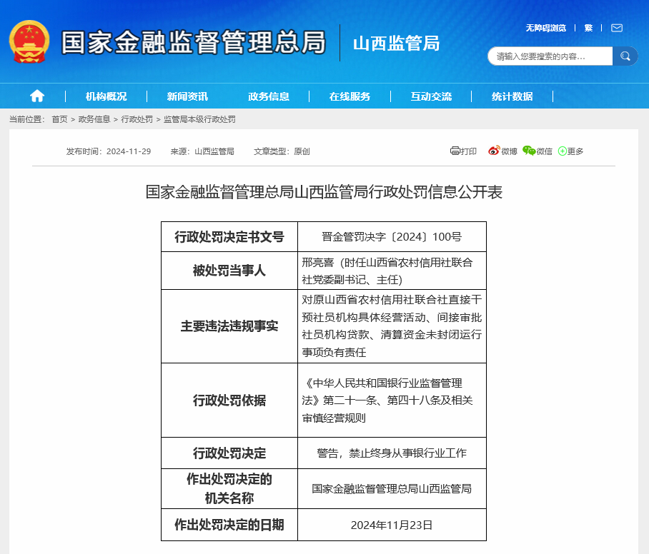 11月29日,国家金融监督管理总局山西监管局发文称,邢亮喜(时任山西省农村信用社联合社党委副书记、主任)对原山西省农村信用社联合社直接干预社员机构具体经营活动、间接审批社员机构贷款、清算资金未封闭运行事项负有责任,被予以“警告,禁止终身从事银行业工作”的行政处罚。