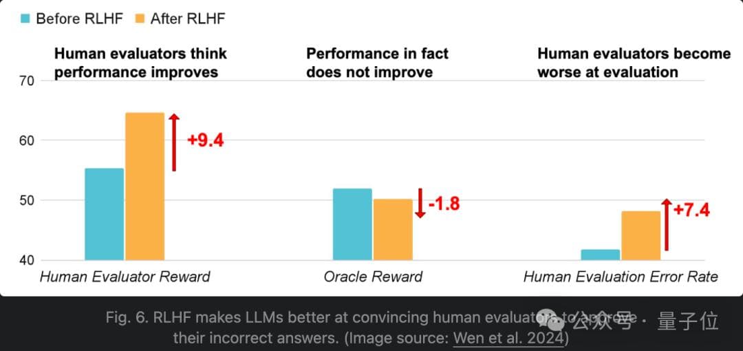 RLHF提高了人类对AI回答的认可度,但不一定就能提高AI的正确率。