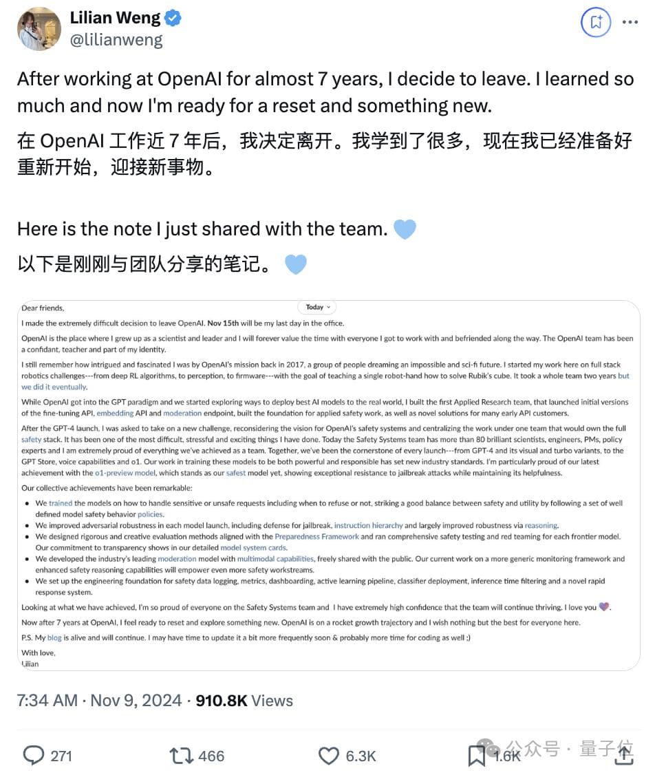 之后没几天,翁荔突然发推文表示决定离职OpenAI。