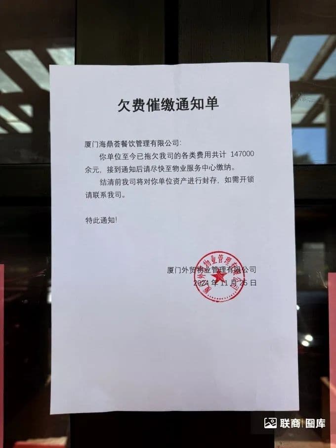 其中“欠费催缴通知单”的落款是厦门外贸物业管理有限公司,上面写着“厦门海鼎荟餐饮管理有限公司拖欠业主方各类费用共计14.7万元,接到通知后尽快至物业服务中心缴纳。”