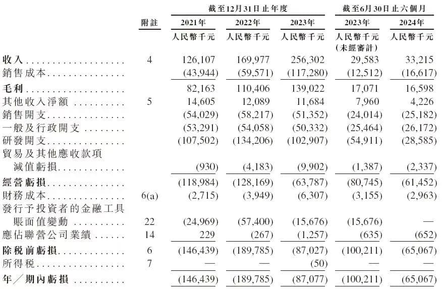 不过,与广泛的市场布局形成鲜明对比的是公司的财务表现。招股书显示, 2021年、2022年、2023年和2024年前六个月,51WORLD的收入分别为人民币1.26亿元、1.7亿元、2.56亿元和0.33亿元;相应期间的净亏损分别为人民币1.46亿元、1.9亿元、8710万元和6510万元。这意味着,三年半时间,51WORLD累计亏损近4.89亿元。