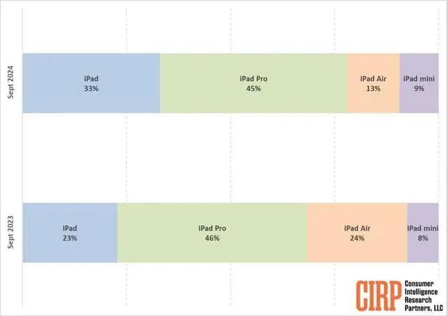 市场调研机构CIRP公布的报告指出,苹果平板电脑全线产品中,今年第三季度销量最高的是iPad Pro,份额高达45%,销量最低的则是iPad mini,份额仅9%。夹在中间的iPad Air定位不上不下,销量下滑较为明显,但份额依然高于iPad mini。