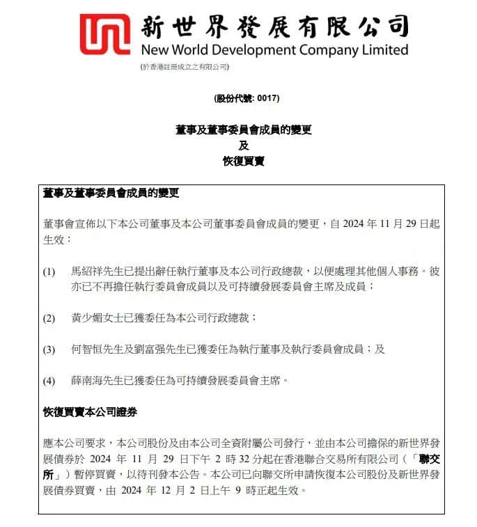 直到当日港股收盘后,新世界正式发布了一则人事变动公告——马绍祥提出辞任公司执行董事及行政总裁,理由是:以便处理其他个人事务。