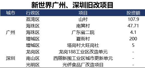 新世界也涉足到旧改领域,曾连续在深圳、广州拿下6个旧村改造项目,土地面积合计180万㎡,包括深圳文锦渡口岸经济带改造项目、西丽旧改、广州山村旧改、南箕村旧改等。