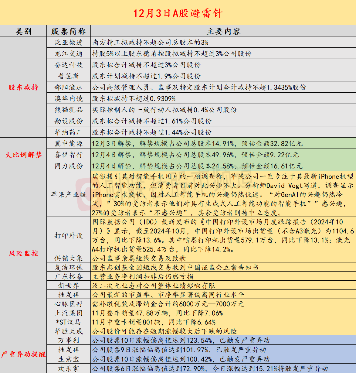 导读:财联社12月3日投资避雷针,近日,A股及海外市场潜在风险事件如下。国内经济信息方面包括:1)交易商协会查实四家农村商业银行对交易员激励过度,导致部分交易员债券交易行为扭曲;2)IDC报告显示,中国打印外设市场出货量同比下降13.6%;公司方面重点关注包括:1)复洁环保股东忠创基金因短线交易收到中国证监会立案告知书;2)3连板广东榕泰提示风险,主营业务净利润扣非后仍然亏损;海外市场重点关注包括:1)瑞银调查称,苹果AI功能手机需求疲软 市场兴趣不大;2)反对派凑足罢免总理票数,法国政府进入“倒台倒计时”。