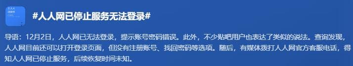 就是这样一个老牌社交平台,今天 ( 12 月 2 日) ,被网友发现“ 人人网已经无法登录了,提示账号密码错误 ” 。