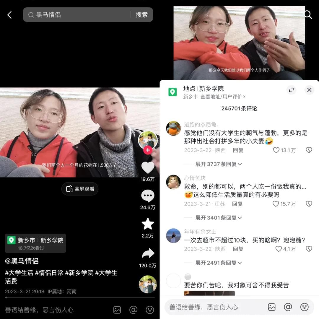 例如前段时间被走红的@黑马情侣 两个人为了省钱无所不用其极,就连最基本的温饱问题都精打细算到极致,感受不到正常恋爱时该有的甜蜜,反而有种窒息感。其中最为典型的视频是“在大学谈恋爱,一个月能花多少钱?”视频中,黑马(男)非常自豪地对网友说他们两个人一个月的花销在1500左右,吃饭作为开支大头,他们恨不得一分钱掰成两半花。