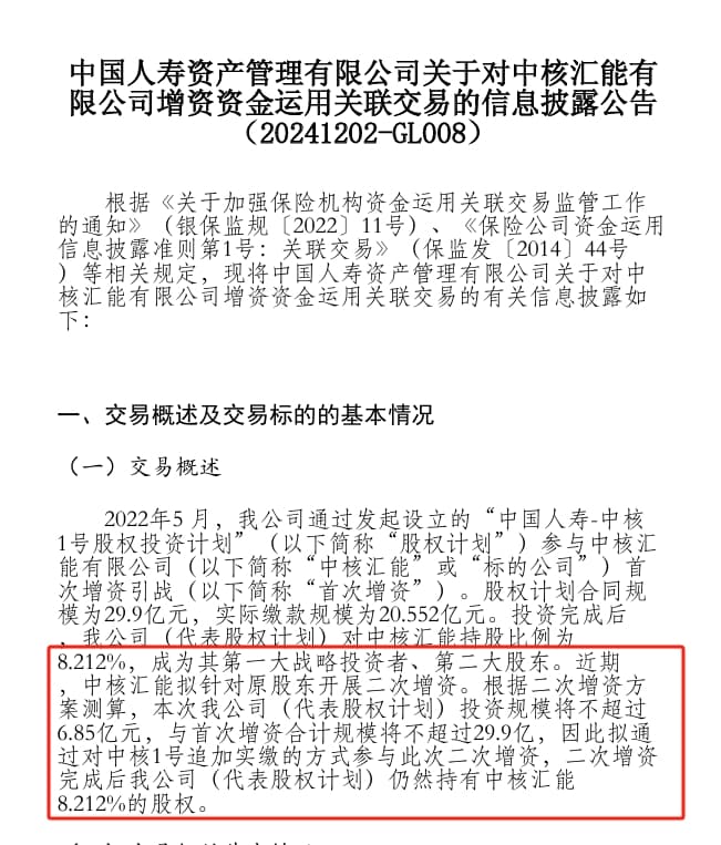 财联社记者注意到,中国人寿资产管理有限公司(下称“国寿资产”)12月2日在官网发布公告称,公司将参与中核汇能有限公司(下称“中核汇能”)的二次增资,本次投资规模将不超过6.85亿元,与首次增资合计规模将不超过29.9亿元。