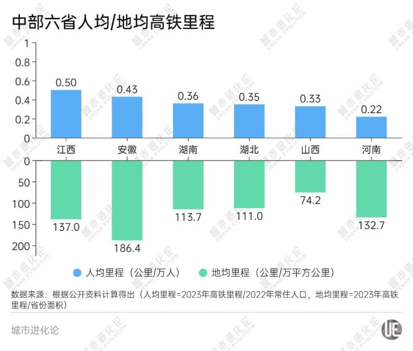 按理说,湖北地处中部,南来北往、东来西往的路线很多会经过。但实际上,截至2023年底,湖北不仅高铁里程低于安徽、湖南、江西、河南,在中部仅高于山西。此外,在人均高铁里程、地均高铁里程、时速350公里高铁里程等指标上,也算不上领先。