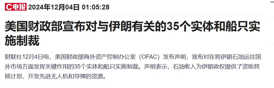 消息方面,美国财政部海外资产控制办公室发布声明,宣布对在将伊朗石油运往国外市场方面发挥关键作用的35个实体和船只实施制裁。声明表示,石油收入为伊朗政权提供了资助其核计划、开发先进无人机和导弹的资源。