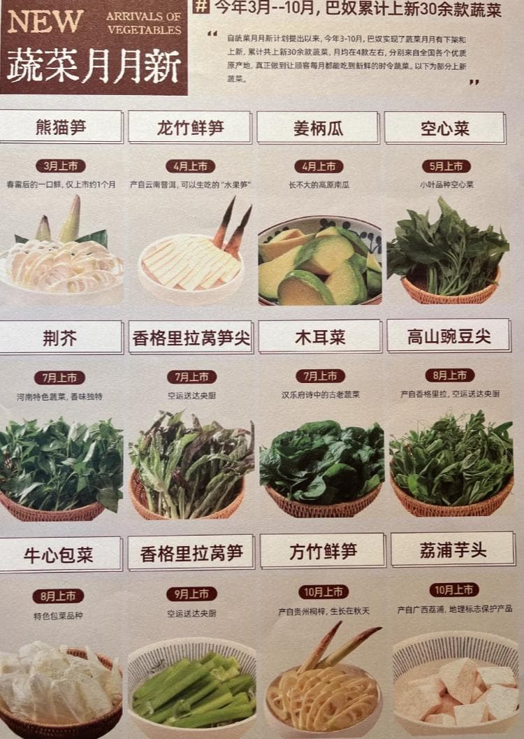 “时令小众蔬菜对老顾客来讲,给到新的体验,起到了一定唤新作用,另外也持续延续了品牌自然健康的理念。”巴奴毛肚火锅员工小林说。