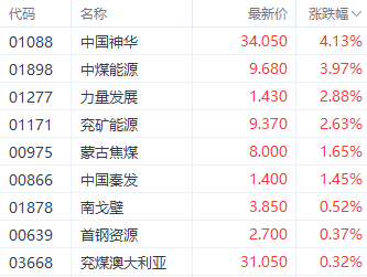 煤炭股中,中国神华(01088.HK)、中煤能源(01898.HK)、兖矿能源(01171.HK)分别上涨4.13%、3.97%、2.63%。