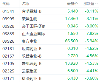 医药股中,宜明昂科-B(01541.HK)、荣昌生物(09995.HK)、康方生物(09926.HK)分别下跌8.11%、8.11%、5.94%。