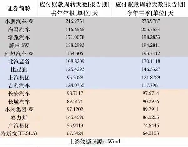 据第一财经发布的从Wind统计的车企应付账款周转天数数据显示,不少车企的付款账期有所拉长。