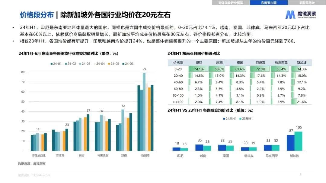 Shopee印尼站2023年全年美妆个护类总销售额高达131亿人民币,同比增长35%。与此同时,印尼的销售均价也是东南亚六国中最低的,20元以下产品销量占比超过74%。此外,越南、泰国、菲律宾、马来西亚同样也依赖低价商品获取市场规模,20元以下占比基本在60%以上。