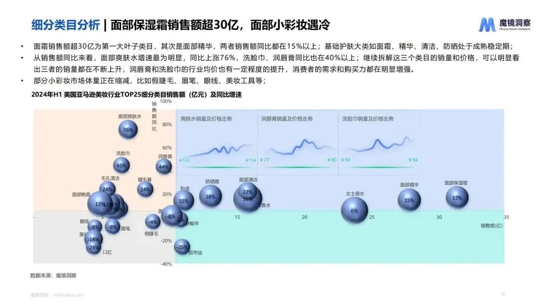 《白皮书》进一步分析显示,2024年H1面霜以30亿的销售额成为规模最大的细分类目,其次是面部精华。从增长速度来看,面部爽肤水、洗脸巾、润唇膏等产品类目的增速最为明显,同比增长40%以上。分析产品的销量和价格可以发现,这三大类目的销量和价格均有所提升,消费者的需求和购买力都显著增强。