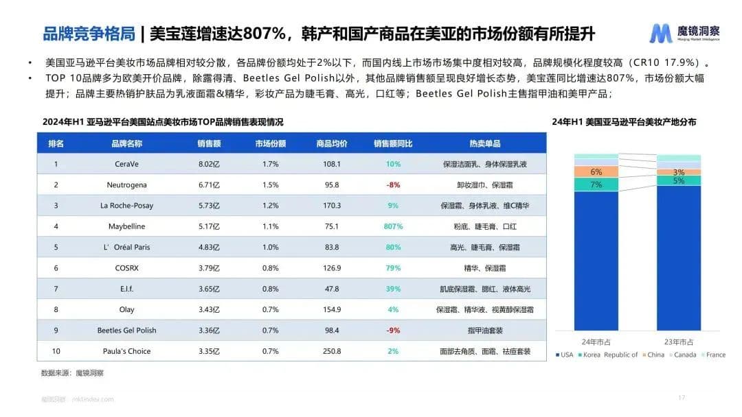 根据《白皮书》数据,美国亚马逊平台各品牌的份额均在2%以下,市场竞争相对较分散,TOP10品牌多为欧美开价品牌。其中美宝莲增长最为亮眼,同比增速达807%,市场份额大幅提升,热销产品主要为睫毛膏、睫毛膏、口红等产品。此外,韩国和中国品牌在美亚的市场份额也有所提升。