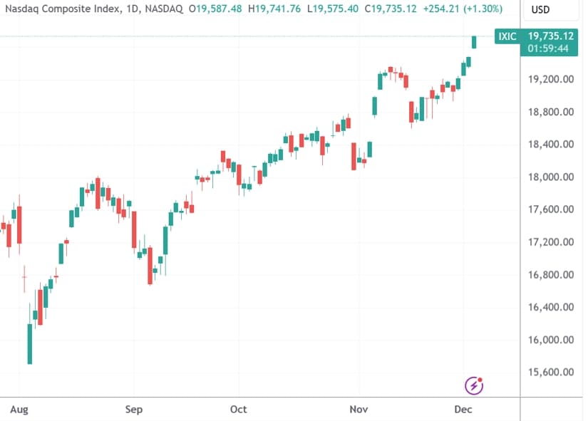 财联社12月5日讯(编辑 史正丞)昨夜今晨,在美联储主席鲍威尔恰到好处地点评美国经济,叠加AI应用和芯片板块同时出现财报利好推动的狂涨股带动,美股三大指数齐创历史新高。