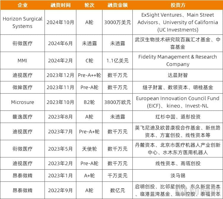 近两年来显微手术机器人融资情况,资料来源:动脉橙数据库