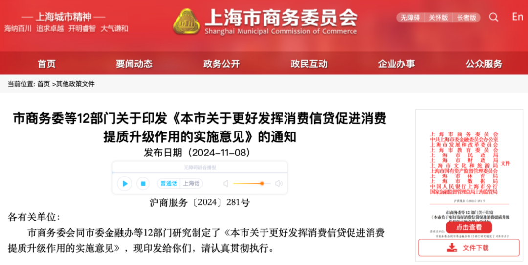 11月8日,上海市商务委等12部门印发《本市关于更好发挥消费信贷促进消费提质升级作用的实施意见》(以下简称《实施意见》)。