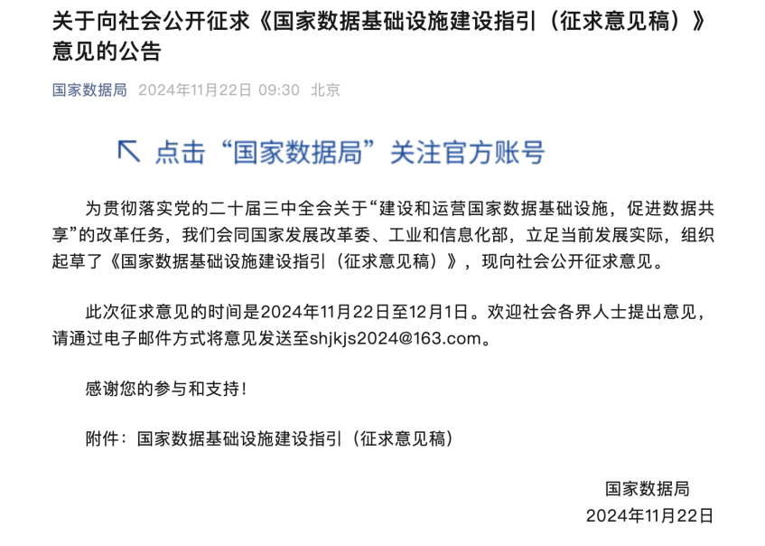国家数据局11月22日消息,国家数据局发布关于向社会公开征求《国家数据基础设施建设指引(征求意见稿)》意见的公告。