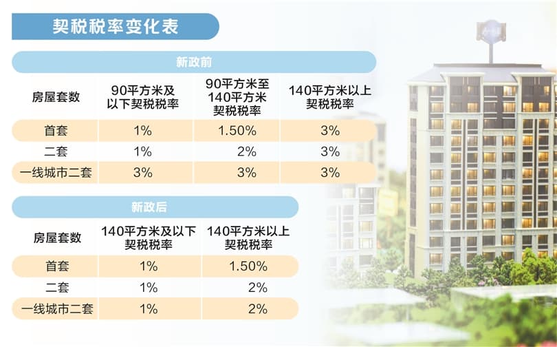 有深圳中介以取消“豪宅税”来形容本次政策。过往只有购买90平方米及以下的房子契税按1%征收,如今140平方米及以下的房子,无论首套还是二套,税率均为1%。“深圳目前新房均价5.7万元,如果客户二套购买140平方米的房子,契税部分就能省近16万元。对于卖房客户,将享受非普通住房购房满两年,免征增值税等政策。”该中介告诉记者。
