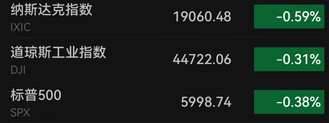 当地时间11月27日周三,美股三大股指集体收跌。截至收盘,道指跌138.25点,跌幅为0.31%,报44722.06点;纳指跌115.10点,跌幅为0.59%,报19060.48点;标普500指数跌22.89点,跌幅为0.38%,报5998.74点。