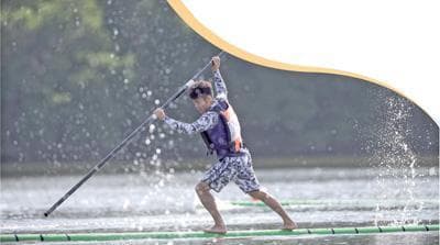 河北队选手在独竹漂项目男子组200米直道赛中。