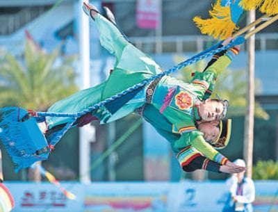 青海队选手表演土族轮子秋。