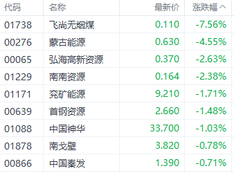 煤炭股中,蒙古能源(00276.HK)、南南资源(01229.HK)、兖矿能源(01171.HK)分别下跌4.55%、2.38%、1.71%。