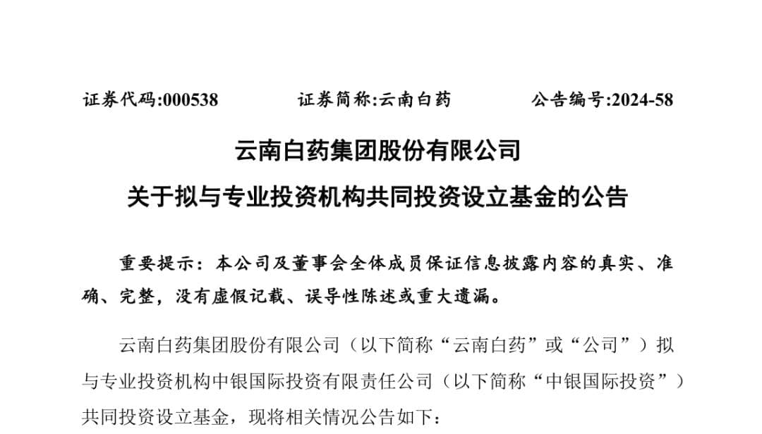 根据公告,云南白药拟于与中银国际投资有限责任公司(简称“中银国际投资”)正式签订《云南省中医药大健康创新基金合伙协议》对各方合作发起设立云南省中医药大健康创新基金(暂定名)进行原则性约定。