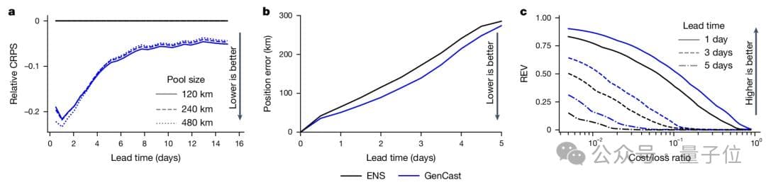 结果在97.2%的场景当中,GenCast的CRPS都显著优于ENS,如果只看对36小时之后的预测,GenCast在99.6%的条件下都能胜出。