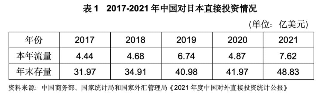 2023年末,我国在发达经济体的直接投资存量为3097.1亿美元,其中对日投资的规模较小,为57.7亿美元,占1.9%。不过,对日投资流量、存量近年均呈上升趋势。截止2021年,我国对日直接投资流量7.62亿美元,如表1所示。