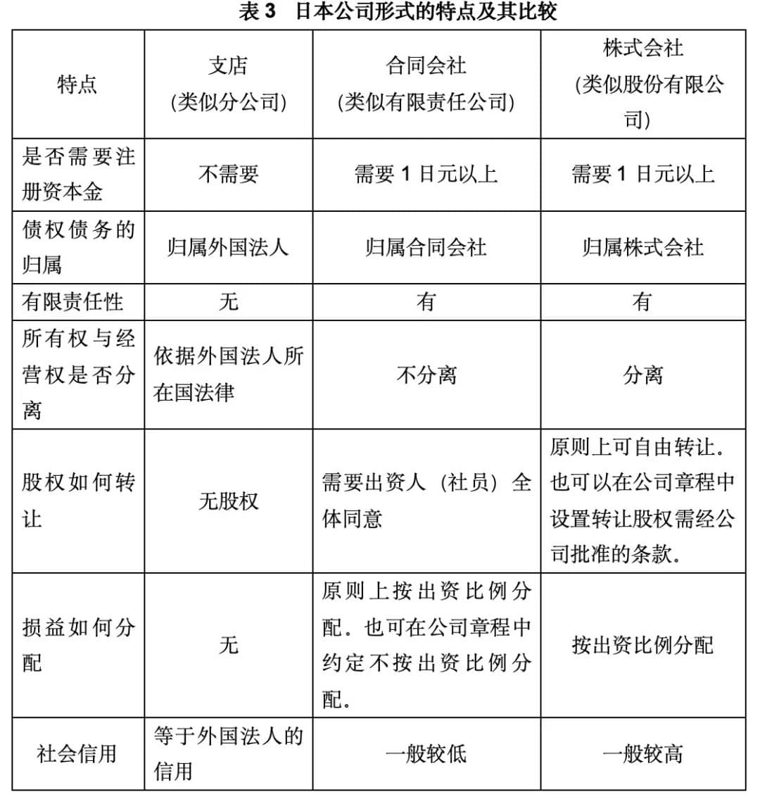 根据日本公司法,外国法人在日本设立公司,可以采用支店、合同会社、株式会社3种形式。3种形式的特点及其比较,如表3所示。