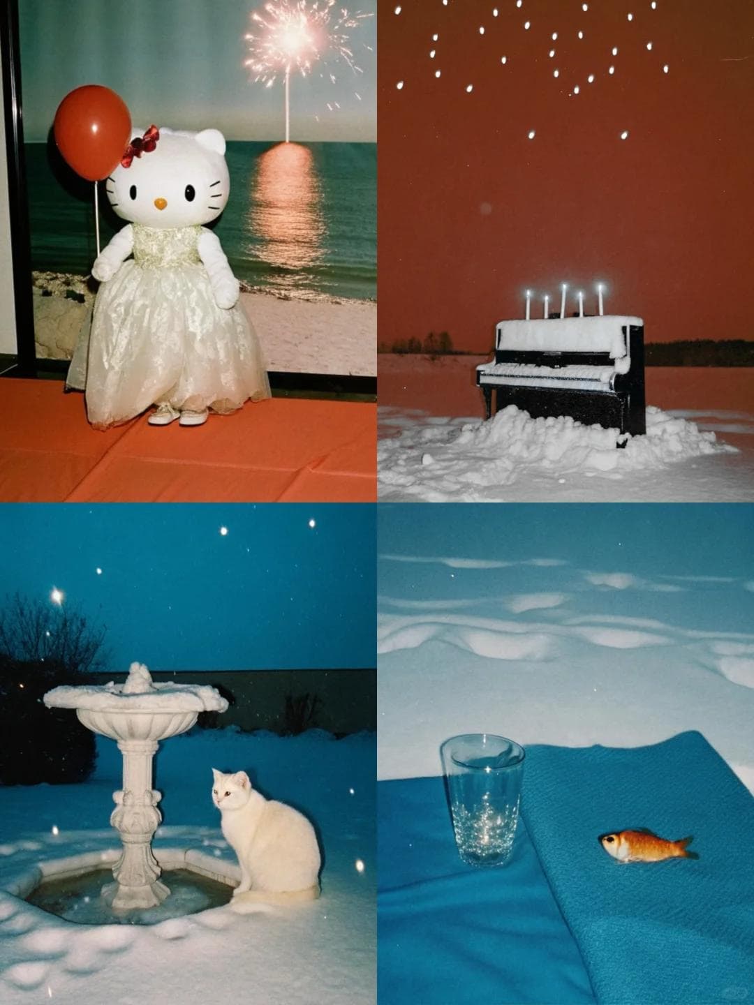 要说咋描述这种风格,我第一反应是五个字——“挺有内味儿”。宝丽来质感闪光灯效果,搭配怪诞又童趣的画面内容,颇具梦核感,一时还以为是哪个小众摄影师的风格化新作。