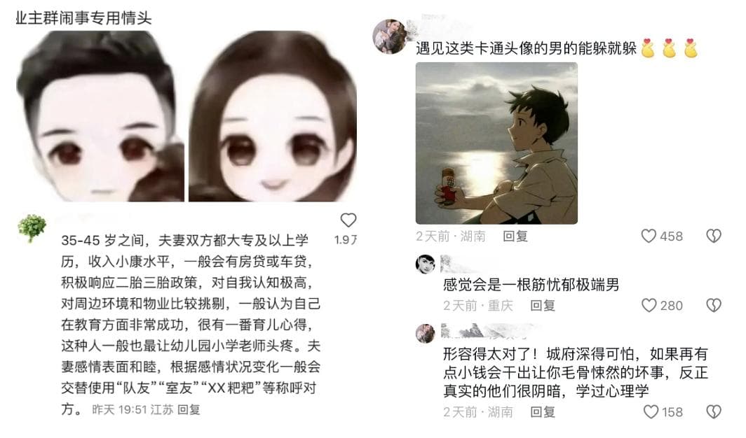 然而以上都是头像学的皮毛,进阶级别的学者们对头像的判断更精准,比如模糊画质+手绘审美+一家三口版情头≈业主群闹事儿的二胎夫妻,用折木奉太郎或头戴金箍至尊宝的必渣男,拿一眼假的土味AI图当头像的普遍不好惹……