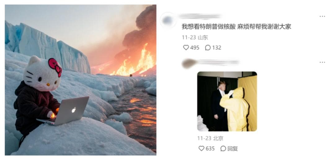 谈“梦核”多少有点意识流,说“抽象”大家就都明白了。用Recraft制造失真和现实之间的混沌感精准狙击大学牲和牛马。还是前文那只面无表情的Hello kitty,在世界末日到来时淡定办公,在冰河世纪里兢兢业业,虽然人疯了,但打工人仍然保留着头上的蝴蝶结和自比喵星人的“萌感”。一时间类似“Hello Kitty"头像席卷朋友圈。