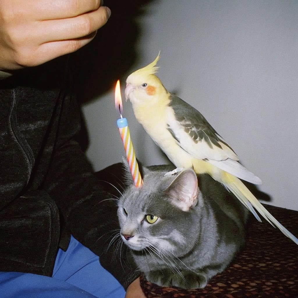 第二次使用的效果更好。我输入“黄色的鸟在灰猫头顶吹蜡烛”的指令,生成了一张细节饱满、充满故事感的图片。尤其让我惊喜的是灰猫细滑的皮毛,乍一看十分写实,还以为是哪位小众独立摄影师给宠物们拍摄的胶片日常。